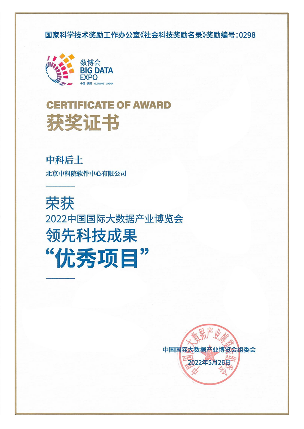 2022中国国际大数据产业博览会领先科技成果“优秀项目”奖